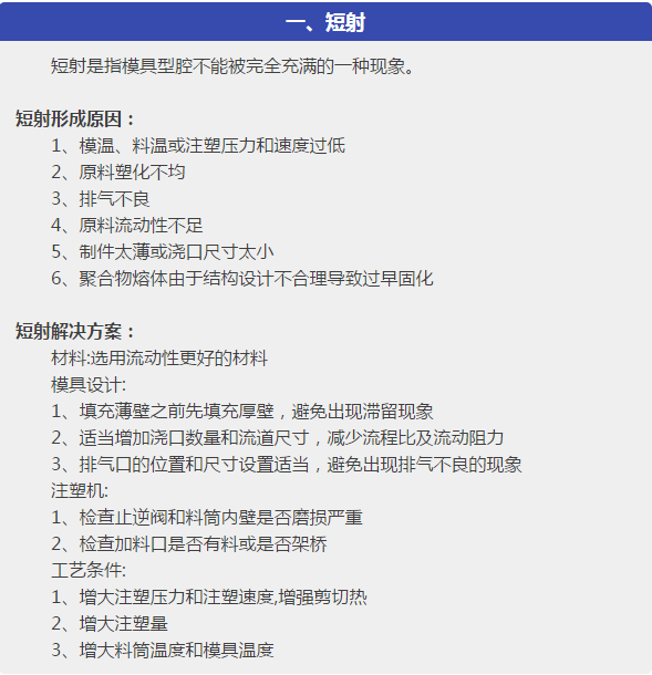 在注塑成型加式過程中,可能由于原材料處理不好、塑件或模具設(shè)計不合理、操作工沒有掌握合適的工藝操作條件,或者因機(jī)械方面的原因,常常使塑件產(chǎn)品短射、凹痕、飛邊、困氣、開裂、翹曲變形等成型缺陷。