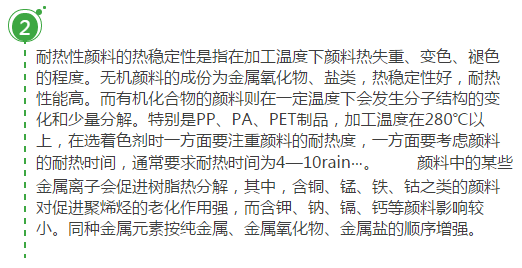 塑料著色制品受多種因素影響會發(fā)生褪色。塑料著色制品的褪色與顏料、染料的耐光性、抗氧性、耐熱性、耐酸堿性以及所用樹脂的特性有關(guān)。應(yīng)根據(jù)塑料制品的加工條件和使用要求,在生產(chǎn)母料時對所需顏料、染料、表面活性劑、分散劑、載體樹脂和防老化助劑的上述性能進(jìn)行綜合評定后才可選用。