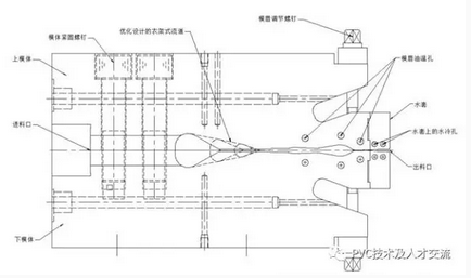 為了克服上述缺點,不少公司在模頭流道優(yōu)化設(shè)計的基礎(chǔ)上,對模具結(jié)構(gòu)進(jìn)行了改進(jìn),設(shè)計了無阻流棒結(jié)構(gòu)模具,并且模唇拼接式改進(jìn)為模唇、模體一體式設(shè)計,甚至增設(shè)冷水模。如下圖