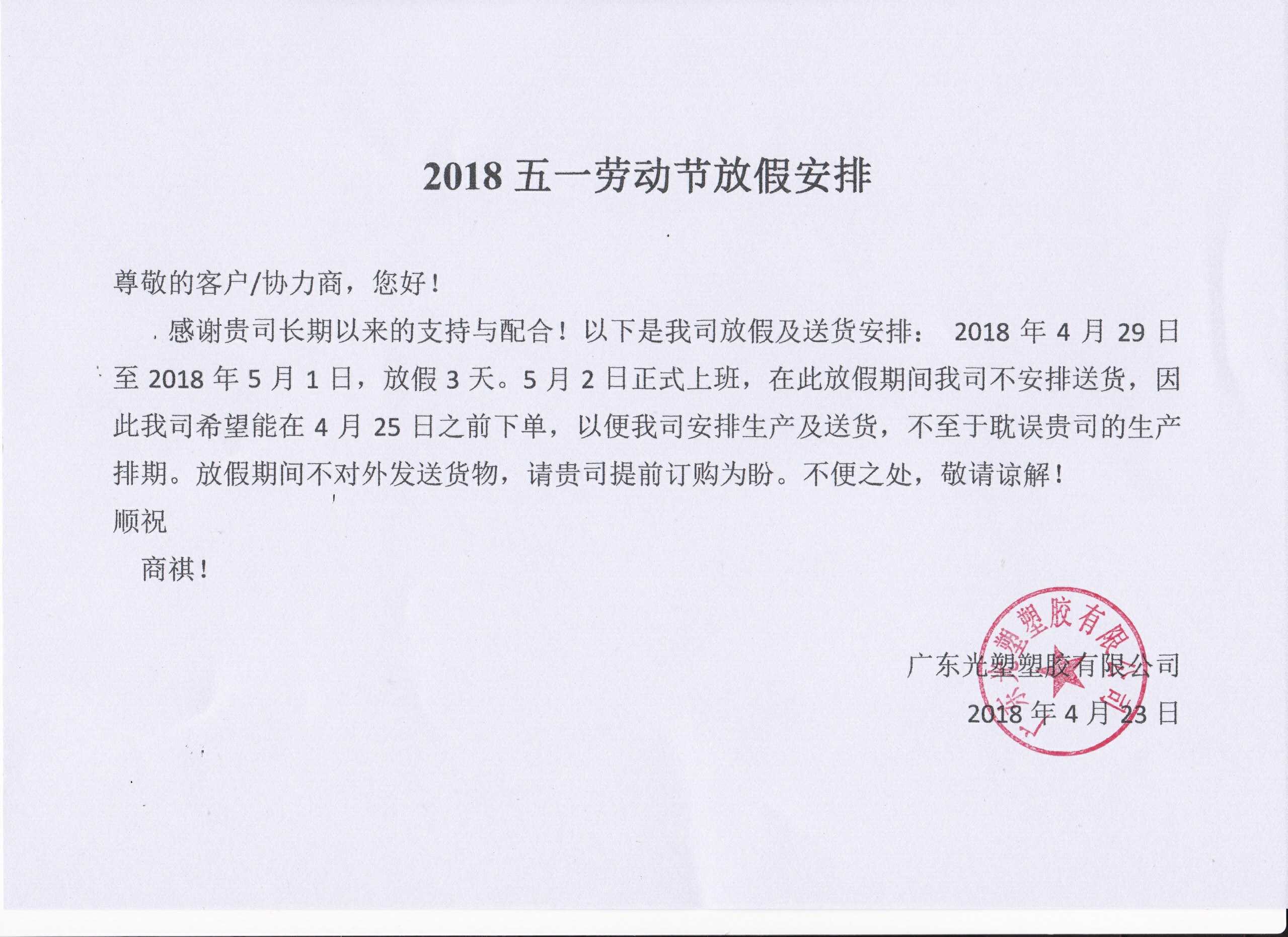 感謝貴司長期以來的支持與配合!以下是我司五一勞動節(jié)放假及送貨安排:2018年4月29日至2018年5月1日,放假三天,5月2日正式上班。在此放假期間我司不安排送貨,因此我司希望能在4月25日之前下單,以便我司安排生產(chǎn)及送貨,不至于耽誤貴司的生產(chǎn)排期。放假期間不對外發(fā)送貨物,請貴司訂購為盼,不便之處,敬請原諒!