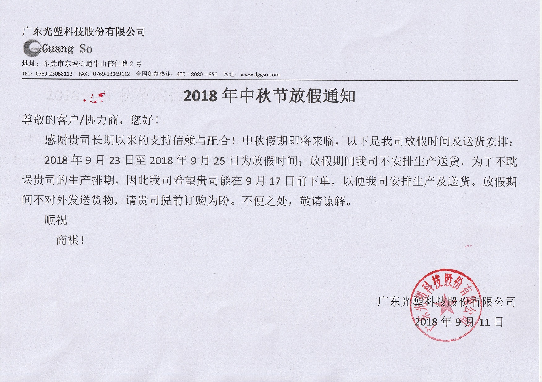 2018年9月23日至2018年9月25日為放假時(shí)間;放假期間我司不安排生產(chǎn)送貨,為了不耽誤貴司的生產(chǎn)排期,因此我司希望貴司能在9月17日前下單,以便我司安排生產(chǎn)及送貨。放假期間不對(duì)外發(fā)送貨物,請(qǐng)貴司提前訂購為盼。不便之處,敬請(qǐng)諒解。