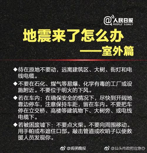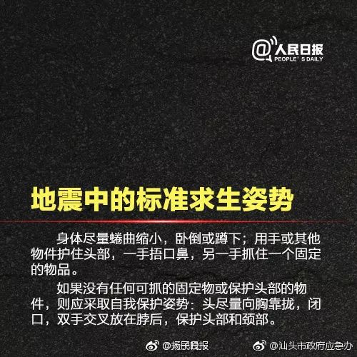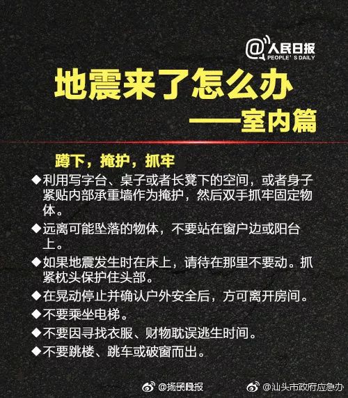 人民日報發(fā)布的《最權(quán)威地震逃生手冊》,當(dāng)?shù)卣鸢l(fā)生時,如果您在床上,應(yīng)該待在那里不要動,抓緊枕頭保護頭部;如果您在室內(nèi)應(yīng)該利用承重墻為掩護,雙手抓牢固定物體。如果您在室外,應(yīng)遠離建筑區(qū)、大樹、街燈和電線電纜。