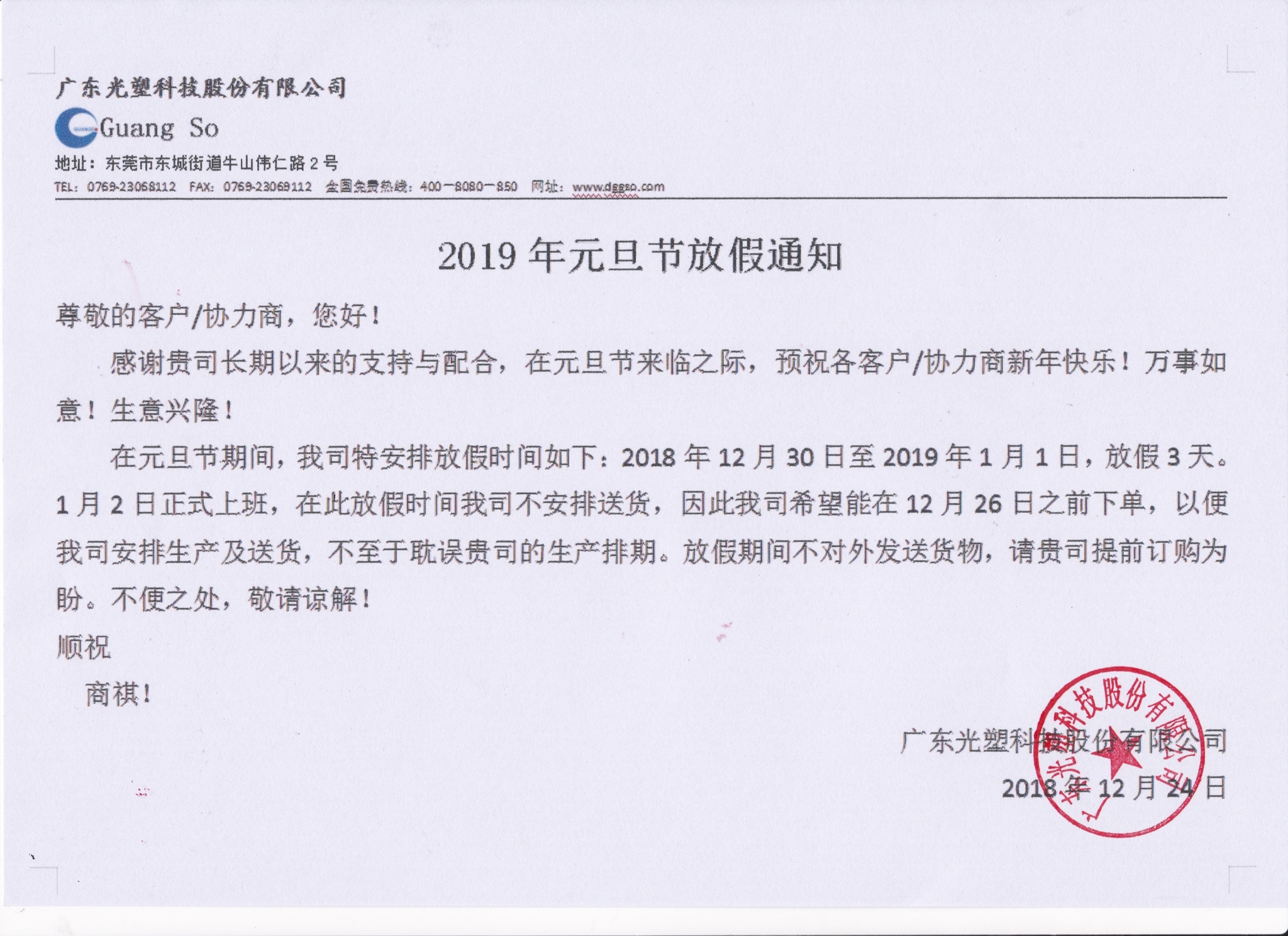 感謝貴司長(zhǎng)期以來(lái)的支持與配合,在元旦節(jié)來(lái)臨之際,預(yù)祝各客戶(hù)/協(xié)力商新年快樂(lè)!萬(wàn)事如意!生意興?。?/span>在元旦節(jié)期間,我司特安排放假時(shí)間如下:2018年12月30日至2019年1月1日,放假3天。1月2日正式上班,在此放假時(shí)間我司不安排送貨,因此我司希望能在12月26日之前下單,以便我司安排生產(chǎn)及送貨,不至于耽誤貴司的生產(chǎn)排期。放假期間不對(duì)外發(fā)送貨物,請(qǐng)貴司提前訂購(gòu)為盼。不便之處,敬請(qǐng)諒解!