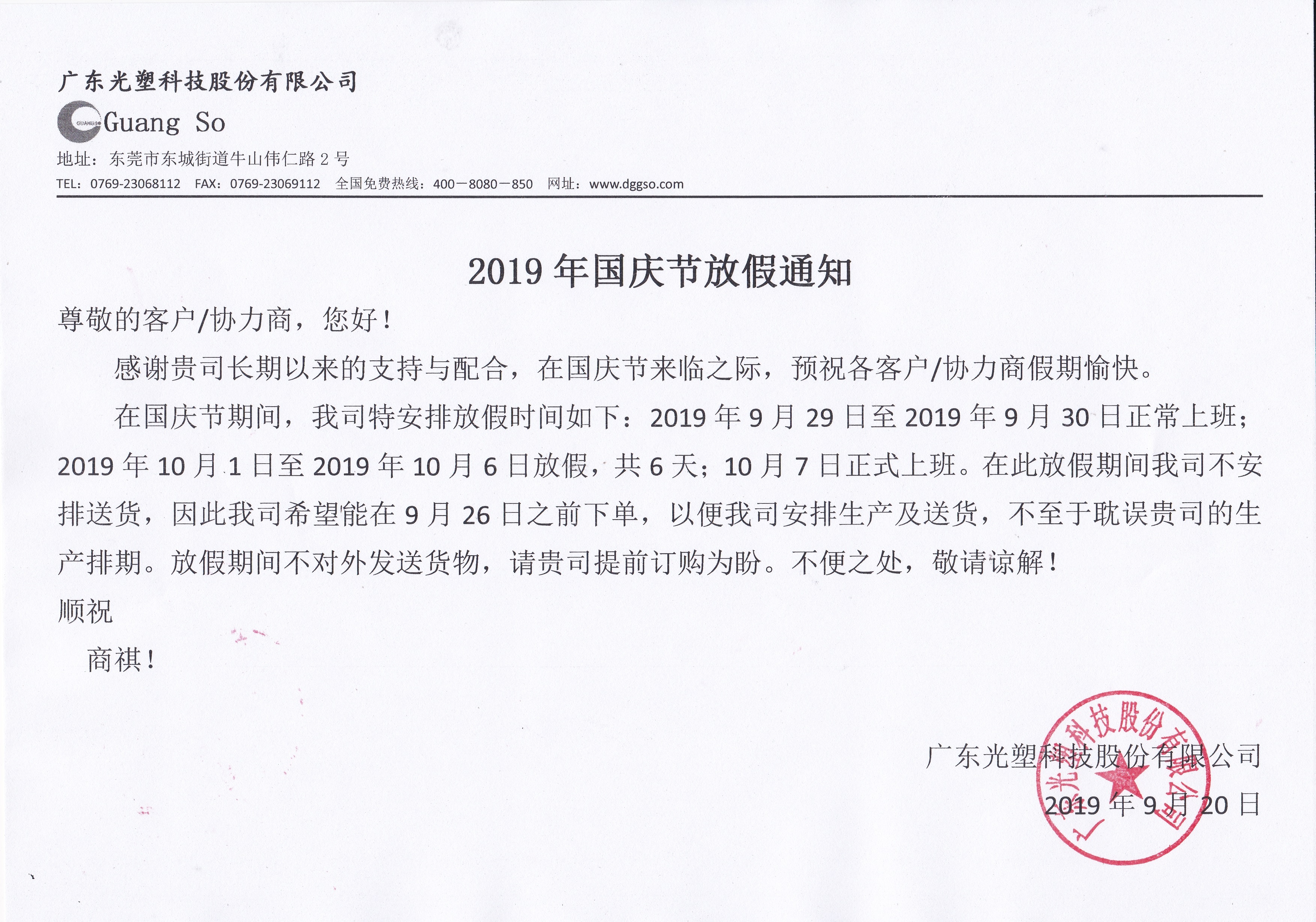 感謝貴司長(zhǎng)期以來(lái)的支持與配合,在國(guó)慶節(jié)來(lái)臨之際,預(yù)祝各客戶/協(xié)力商假期愉快。在國(guó)慶節(jié)期間,我司特安排放假時(shí)間如下:2019年9月29日至2019年30日正常上班;2019年10月1日至2019年10月6日放假,共6天;10月7日正式上班。在此放假期間我司不安排送貨,因此我司希望能在9月26日之前下單,以便我司安排生產(chǎn)及送貨,不至于耽誤貴司的生產(chǎn)排期。放假期間不對(duì)外發(fā)送貨物,請(qǐng)貴司提前訂購(gòu)為盼。不便之處,敬請(qǐng)諒解!