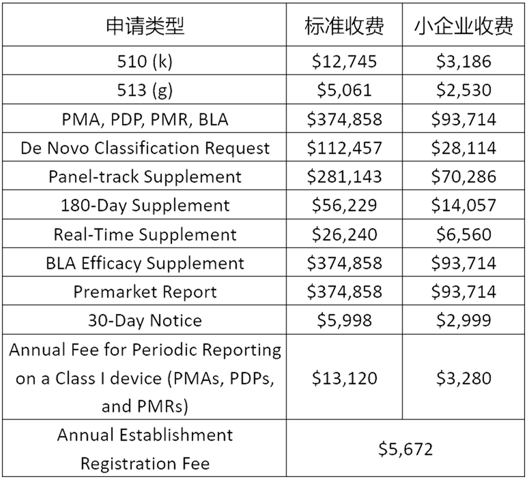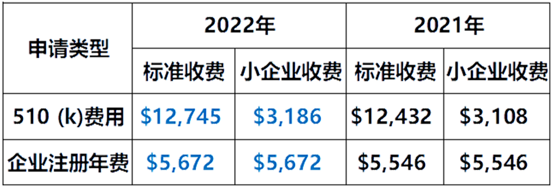 2021年8月2日,美國FDA關(guān)于2022年的收費標(biāo)準(zhǔn)已正式公布。其中FDA企業(yè)注冊和器械列名的年費和510(K) 申報費用對中國的制造商影響比較大,這兩項費用都略有提高。
