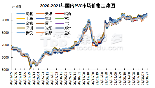 本周(2021.8.23-2021.8.27)PVC市場價格周內(nèi)現(xiàn)貨價格先漲后跌,周一到周三維持了小幅上漲為主,周四現(xiàn)貨市場價格開始出現(xiàn)分化,周五現(xiàn)貨價格出現(xiàn)下行。整體來看周內(nèi)現(xiàn)貨價格均一直維持在高位。成交方面仍舊維持清淡,下游采購積極性欠佳,過高的采購壓力使得行情雖然已經(jīng)逼近9月份,需求方面卻遲遲不見好轉(zhuǎn),淡季或?qū)⒃诟呶籔VC價格的壓制下延續(xù)。下游開工方面變化不大,制品企業(yè)多維持生產(chǎn)為主,8月23日廣東地區(qū)執(zhí)行“開五停二”的有序用電新政策。但目前需求方面對于整體來講并未凸顯出較大的影響,仍需持續(xù)觀察江蘇、廣東地區(qū)的能耗控制政策。出口方面:本周亞洲市場受供應(yīng)緊張及海運費上漲帶動,價格上漲30-40美元/噸,CFR中國在1310美元/噸,CFR東南亞在1320美元/噸,CFR印度在1560美元/噸。整體來看周內(nèi)市場運行尚可,整體現(xiàn)貨價格呈現(xiàn)上漲趨勢。從估價對比來看,其中華北地區(qū)上漲70-95元/噸,華東地區(qū)上漲25-35元/噸,華南地區(qū)上漲55-125元/噸,廈門下跌25元/噸,東北地區(qū)上漲75元/噸,華中地區(qū)上漲100-125元/噸,西南地區(qū)上漲50元/噸